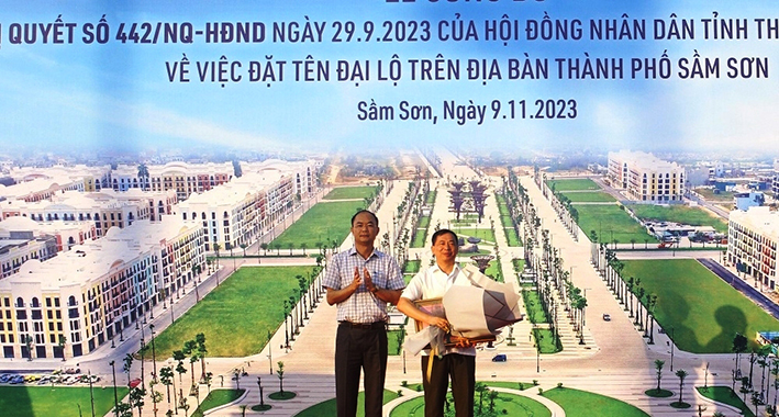 Ảnh công bố và trao Nghị quyết số 442/NQ-HĐND ngày 29/9/2023 của HĐND tỉnh về việc đặt tên Đại lộ Đông Sơn, TP Sầm Sơn.