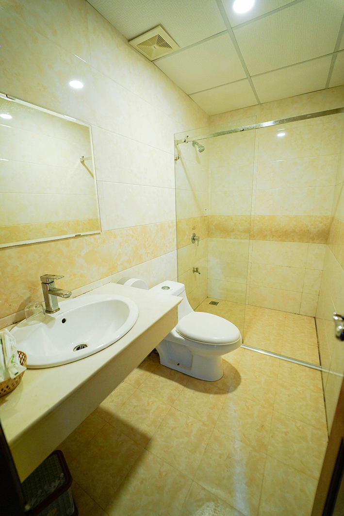 Trang thiết bị trong phòng tắm bao gồm: Bình nóng lạnh, bồn tắm đứng hoặc bồn tắm nằm, bộ khăn tắm, bàn chải đánh răng, kem đánh răng, dầu gội đầu, sữa tắm,…