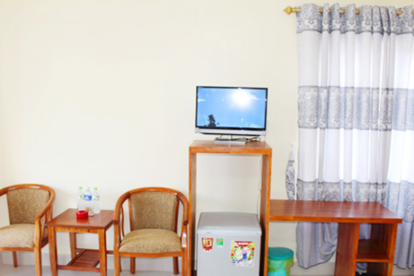 Nội thất trong phòng được trang bị đầy đủ từ đồng hồ, quạt trần, điều hòa, tủ lạnh, tivi, bình nóng lạnh, tủ đựng quần áo, bàn ghế uống nước, dép đi trong phòng và một số vật dụng cá nhân khác.
