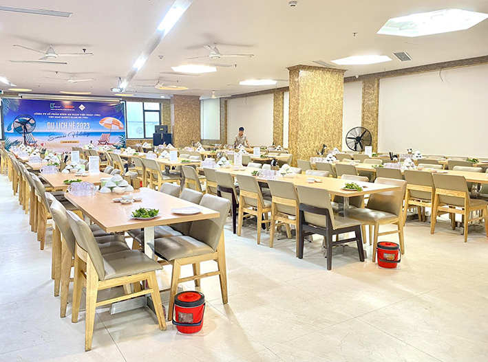Khách sạn phục vụ bữa sáng tiêu chuẩn với giá chỉ 40.000đ/suất. Đối với bữa ăn chính, thực đơn phong phú từ 180.000đ/suất với các món ăn đặc trưng miền biển: tôm hùm, cua ghẹ, mực trứng, cá song, canh chua, hải sản hấp bia, nướng mọi… Tất cả được chế biến bởi đầu bếp nhiều năm kinh nghiệm, đảm bảo hương vị hấp dẫn, an toàn và hợp khẩu vị nhiều vùng miền.