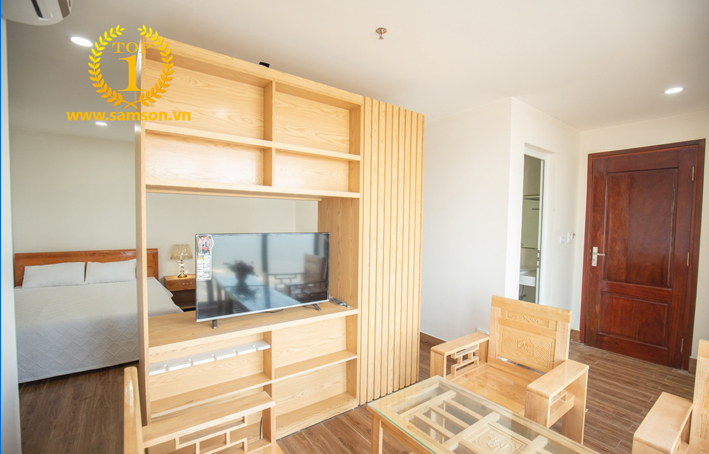 Nội thất tại phòng ngủ được trang bị đồng bộ với đầy đủ tiện nghi hiện đai: tivi phẳng, tủ lạnh 100%, điều hòa, bình nóng lạnh, tủ đựng quần áo, dép đi trong phòng, điện thoại bàn,…