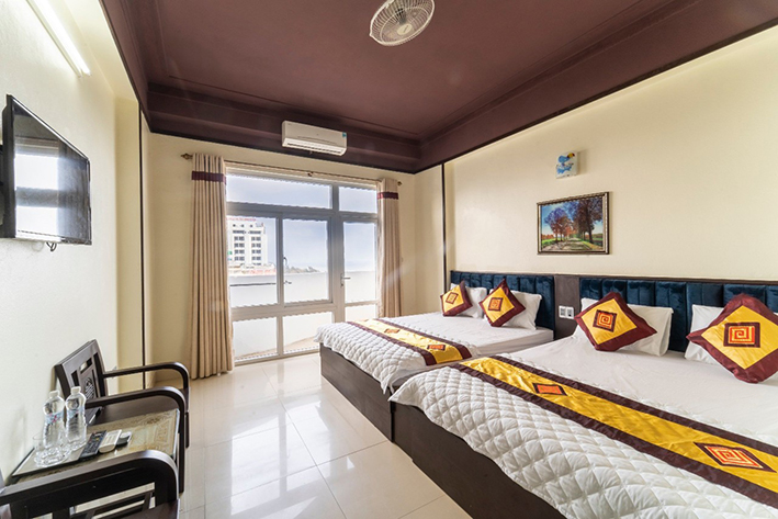 - Khách sạn nằm trên trục đường Hồ Xuân Hương, bãi tắm A. Hệ thống khách sạn gồm 136 phòng nghỉ. Trong đó, có 12 phòng VIP và 124 phòng đôi tiêu chuẩn sạch sẽ. Được trang bị đầy đủ thiết bị tiện nghi.