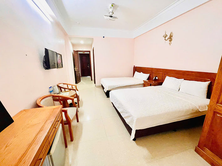 Nội thất phòng ngủ tại khách sạn được trang bị đầy đủ tiện nghi hiện đại như: tivi, tủ lạnh, điều hòa, bình nóng lạnh, wifi, bàn ghế làm việc, tủ đựng quần áo..........