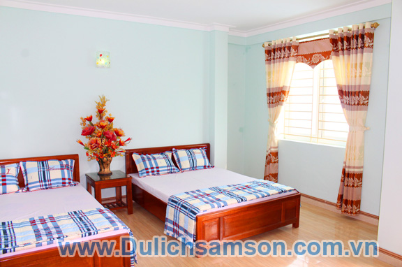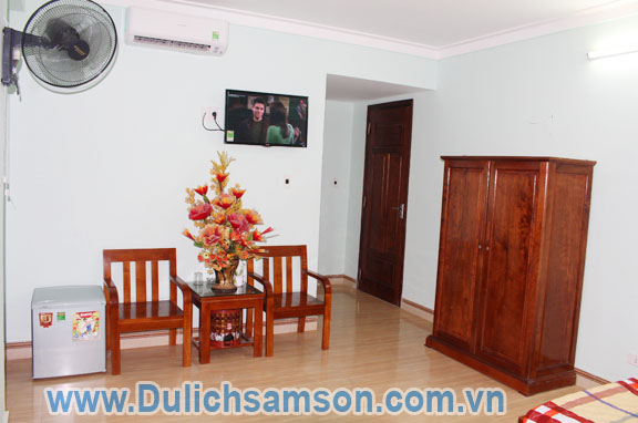Phòng nghỉ có trang bị đầy đủ tiêu chuẩn của một khách sạn 2 sao như: tivi siêu mỏng 32inch, tủ lạnh, điều hòa 2 chiều, nóng lạnh, vòi hoa sen, 2 giường 1.5m, chăn ga gối đệm cao cấp, quạt treo tường, tủ đựng đồ, bàn trà , khăn tắm…