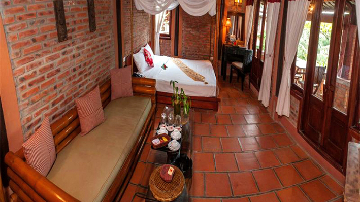 👉 Với thiết kế mang đậm dấu ấn văn hóa miền quê Bắc Bộ xưa, Vạn Chài Resort khiến du khách như được trở về với một không gian giản dị, gần gũi và ấm áp. Từ những ngôi nhà gỗ mái ngói đỏ, cho đến các khu vườn xanh mát, resort này mang đến cảm giác thư thái, thanh bình, giúp du khách tạm rời xa những ồn ào, vội vã của cuộc sống thường ngày.