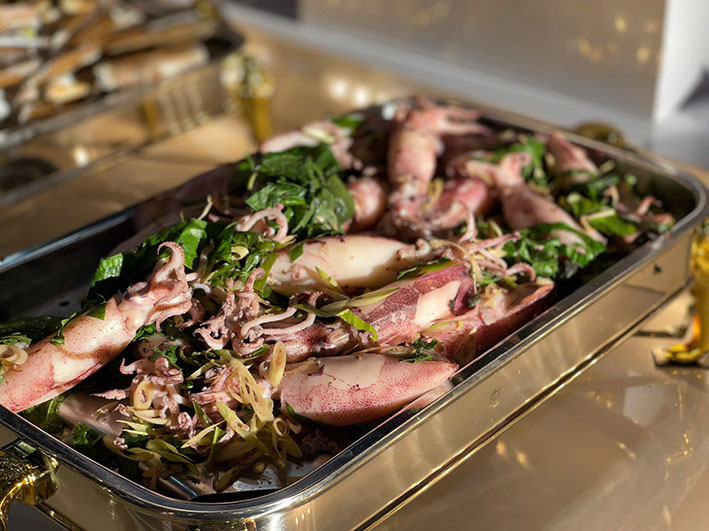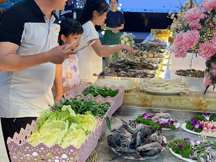 Hải sản luôn là " Ngôi sao " trong ẩm thực được nhà hàng chế biến và bày trên quầy line cho du khách lựa chọn theo nhu cầu. Các loại hải sản đa dạng như :