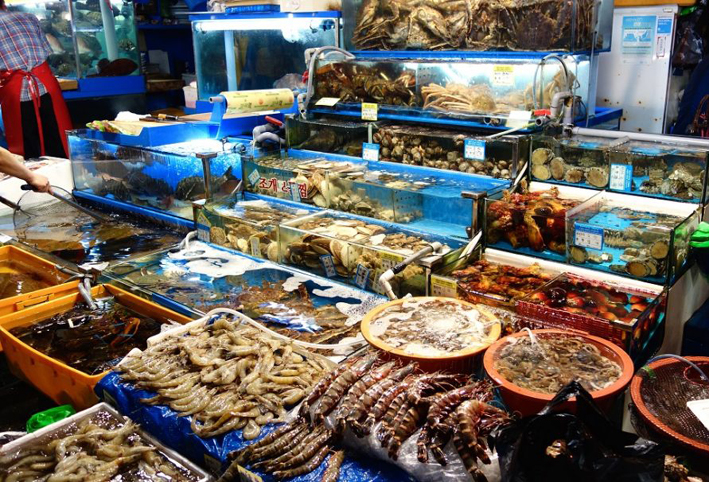 Hải sản luôn là " Ngôi sao " trong ẩm thực được nhà hàng chế biến và bày trên quầy line cho du khách lựa chọn theo nhu cầu. Các loại hải sản đa dạng như :