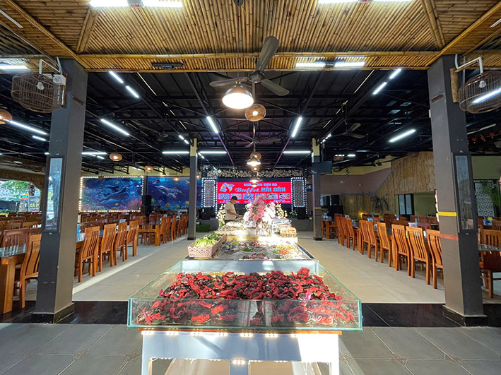 Với không gian phục vụ ăn uống vô cùng rộng rãi, các sảnh ăn, phòng lạnh được thiết kế thoáng mát, tiện nghi hiện đại. Nhằm đem lại sự thoải mái, dễ chịu khi quý thực khách dùng bữa tại đây.